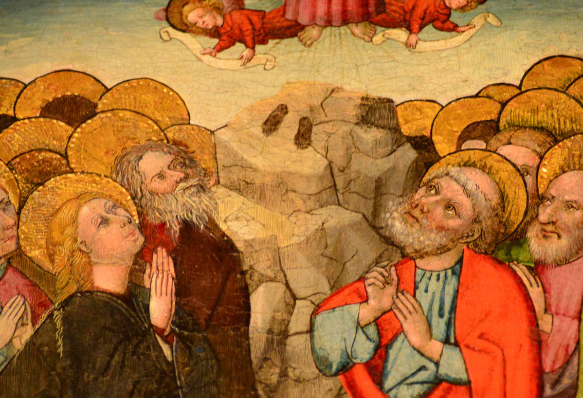 Sobre las invocaciones de las dos tablas laterales están pintadas ocho historias de la Virgen, los siete gozos y la coronación, a saber – de izquierda a derecha y de arriba a abajo: la Anunciación, el Nacimiento de Jesús, la Adoración de los Reyes, la Resurrección, la Ascensión de Jesús, la Venida del Espíritu Santo, la Muerte de la Madre de Dios y la Coronación de ésta.